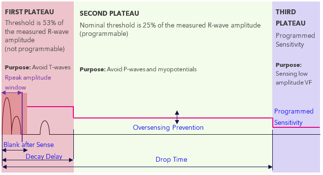 Figure 1 - Operation of Sensing Thresholds - The first plateau duration (“Decay Delay”) is nominally 360 ms, the second plateau duration (“Drop Time”) is nominally 1500 ms, and the third plateau lasts until another sensed beat. R-wave amplitude measurements take place during “Rpeak amplitude window” shown above, nominally 128.75 ms (not programmable).
