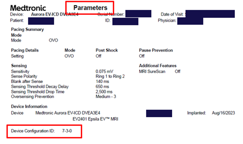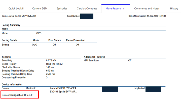 The Device Configuration ID can be found under the “Device Information” section of the SmartSync Parameters Report, or for CareLink patients, under the Transmission Details page by selecting